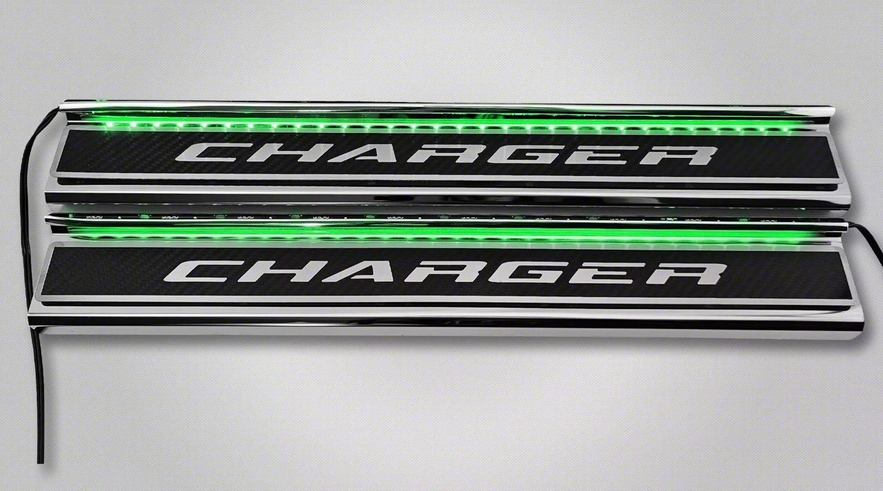 Construction and Appearance. Crafted from premium stainless steel and carbon fiber, these door sills feature a polished finish for durability and shine. The brushed "CHARGER" lettering and logo add sophistication, while integrated green LED lighting options offer vibrant illumination for added style.