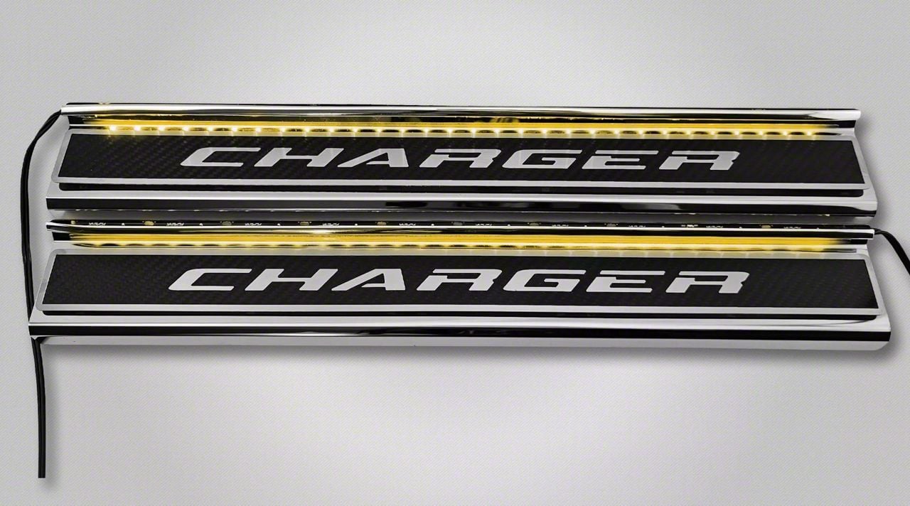Custom Entry Lighting. The Illuminated Door Sills provide an eye-catching detail each time you enter your vehicle. Built for Fits 2015-2023 Dodge Charger Models, these sills feature bright yellow illumination paired with a bold carbon fiber Charger lettering design. They enhance the look of your door threshold while offering added visibility and personalization.