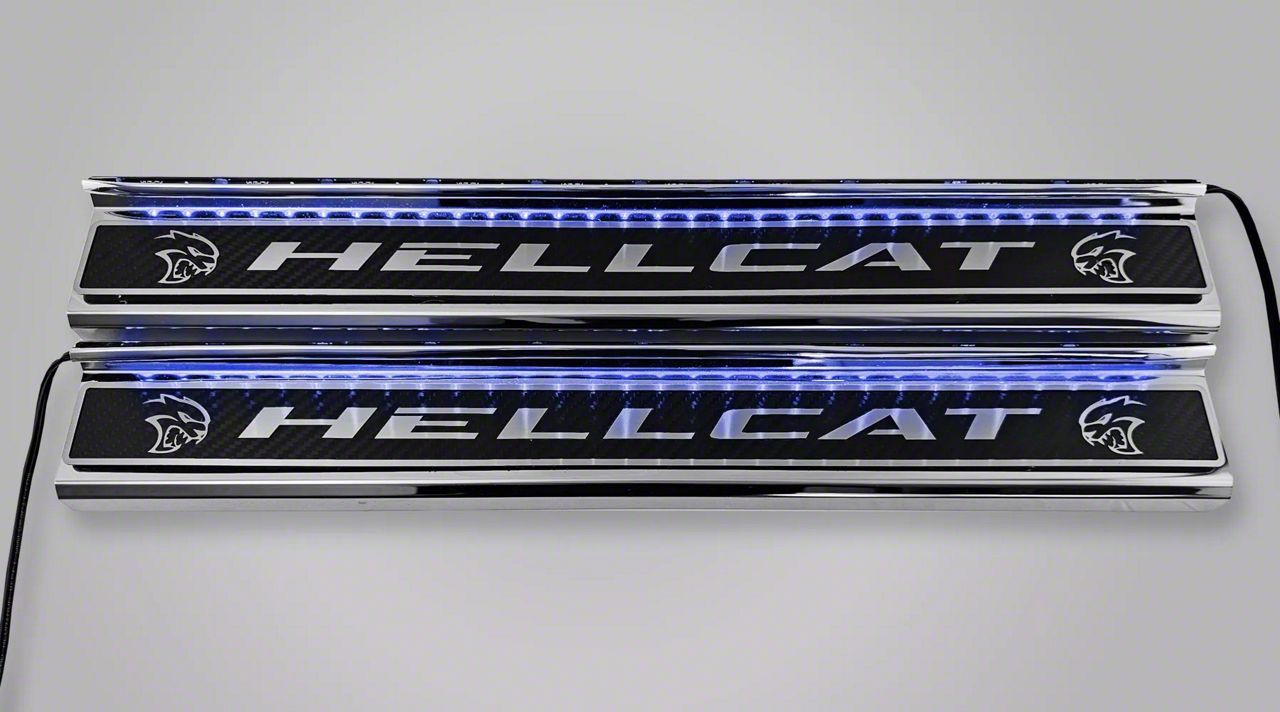 Stylish Entry Accent. The Illuminated Door Sills are a sleek enhancement designed to elevate your Dodge Charger’s interior. With their signature Hellcat lettering and vibrant blue illumination, these sills provide both visual appeal and added protection against common scuffs and scratches. Specifically crafted for 2015-2023 Dodge Charger models, they bring a distinctive custom touch to your vehicle’s cabin while maintaining OEM-level quality.