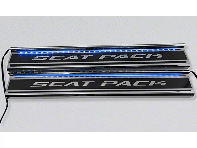 Construction and Appearance. Built from high-grade stainless steel and carbon fiber, these door sills showcase a dual-finish design with polished chrome and black carbon fiber accents. The integrated LED lighting system glows in a vibrant blue, illuminating the Scat Pack lettering design. Each piece is crafted with attention to detail and is officially licensed by Mopar, ensuring authenticity and long-lasting visual impact.