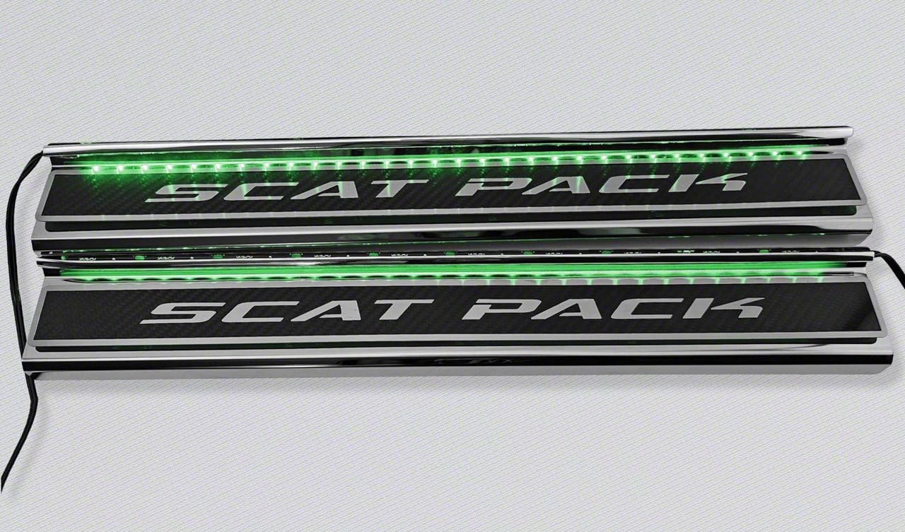 Construction and Appearance. Each sill plate is crafted from durable stainless steel and enhanced with carbon fiber design elements, ensuring a high-end look with long-lasting resilience. The glowing green illumination paired with detailed Scat Pack branding adds a striking and customized aesthetic that complements performance styling.