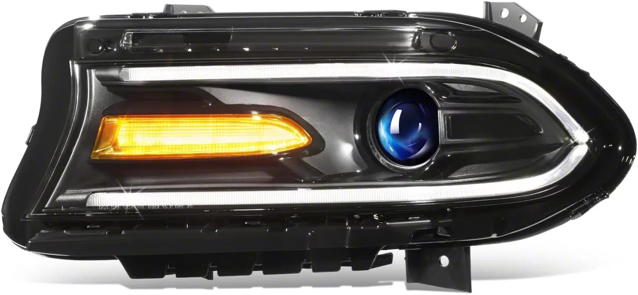Construction and Appearance. Built with a durable black housing and a clear lens, this headlight offers both durability and aesthetics. The clear corner design provides a clean, high-end appearance that blends seamlessly with your Charger's aggressive styling.