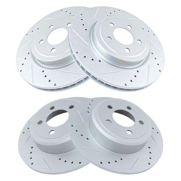 Stopping Power and Reliability. Upgrade your vehicle's braking performance with our Performance Drilled and Slotted Rotors. This set includes both Front and Rear rotors, providing a comprehensive solution for enhanced stopping power. The Front Rotors measure 13.58 inches in diameter, while the Rear Rotors are 12.60 inches in diameter, ensuring a perfect fit for your vehicle. Our rotors are precision-engineered with Cross-Drilled and Slotted designs. This unique pattern helps dissipate heat, reduce brake fade, and improve overall braking efficiency, making them ideal for high-performance driving.