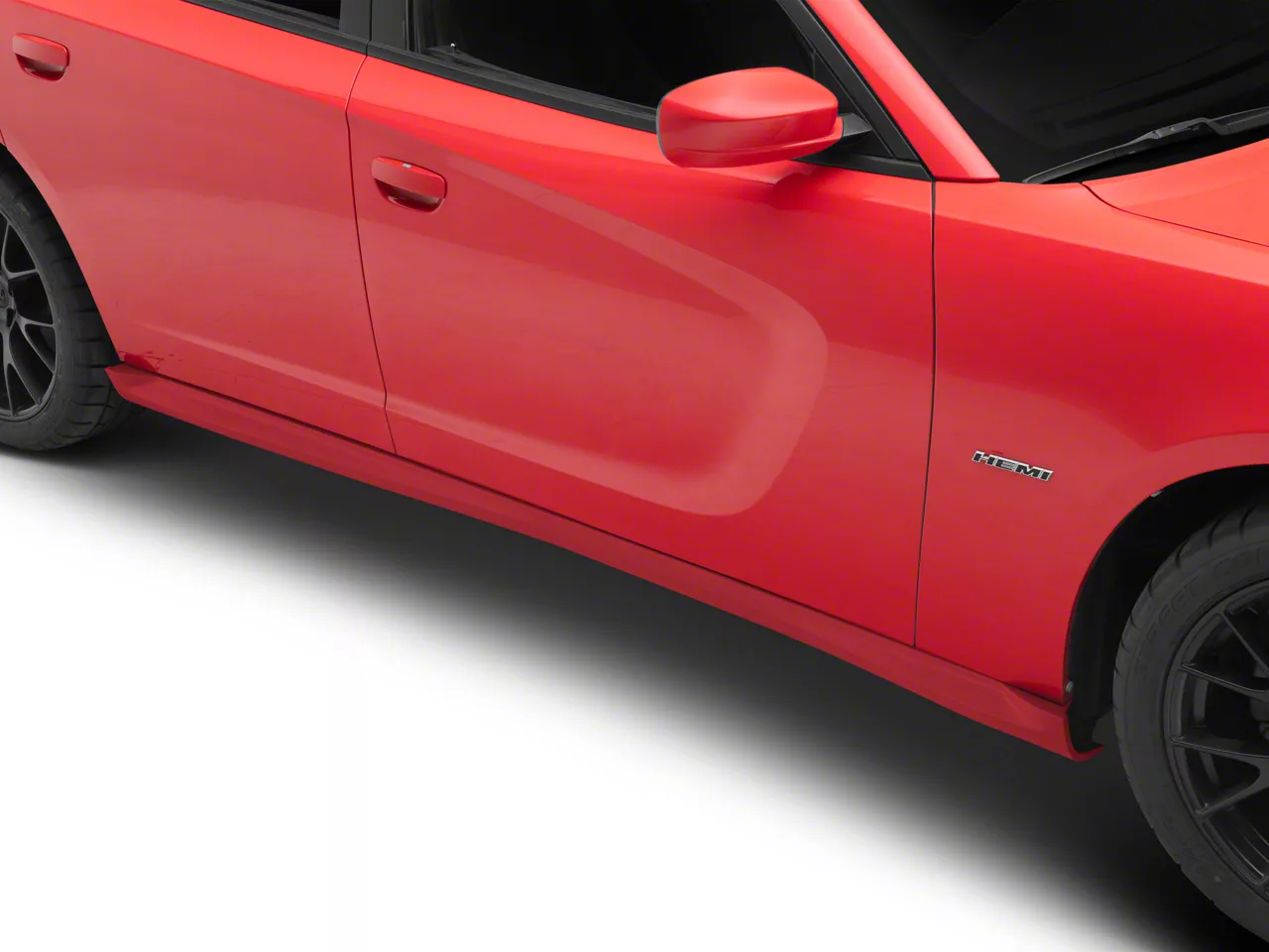 Hellcat Style Side Skirt. Give your Charger a renewed look with this SRT Hellcat Widebody Style Side Skirts; Unpainted. Designed for an OEM fit, this Widebody Side Skirt easily slips in to your vehicle with little to no adjustments needed.