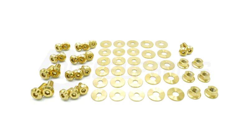 Construction and Features. Crafted from high-quality GR5 titanium material, this kit offers exceptional strength, lightweight properties, and resistance to corrosion. The 56-piece set includes nuts, bolts, and washers, designed to replace your existing hardware with superior components. The metallic gold finish adds a bold and eye-catching touch to your engine bay.