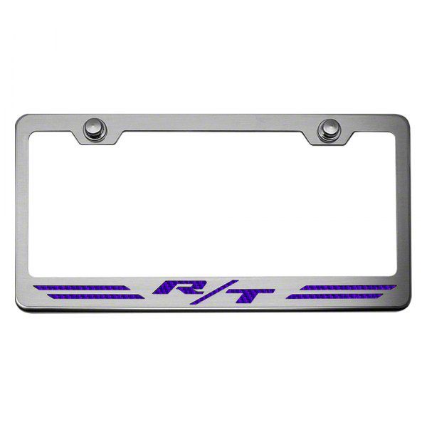 Design. The unique purple carbon fiber design of this Stainless Steel R/T Dodge License Plate Frame adds a significant touch of elegance and personal style to your vehicle. Its vibrant and glossy appearance is perfect for Dodge enthusiasts who wish to display their brand loyalty and simultaneously enhance their vehicle's aesthetic with a striking, colorful accent. This stylish frame serves not only as a legal requirement but also as a statement piece that can set your vehicle apart from others, reflecting your unique taste and attention to detail.