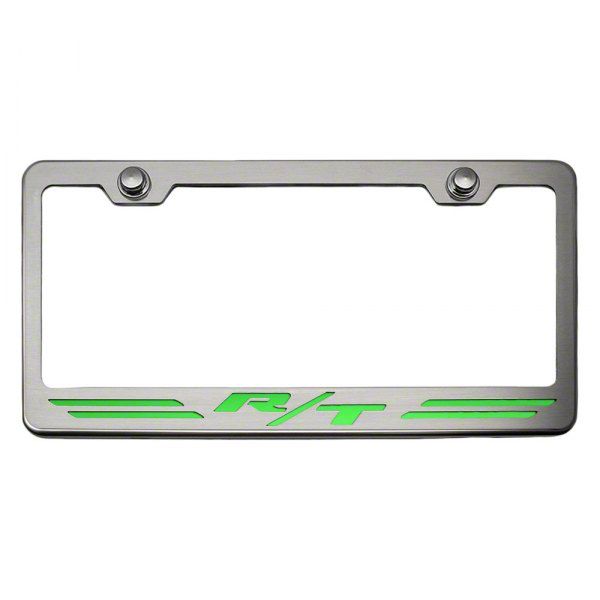 Description. Show your Dodge Charger or Challenger some love with our officially licensed Mopar License Plate Frame "R/T" Style. Also, makes a great gift. These custom tag frames are handcrafted from 304 stainless steel and feature a custom vinyl inlay that allows you to add your custom style to the piece. Choose a color above that coordinates with your car.