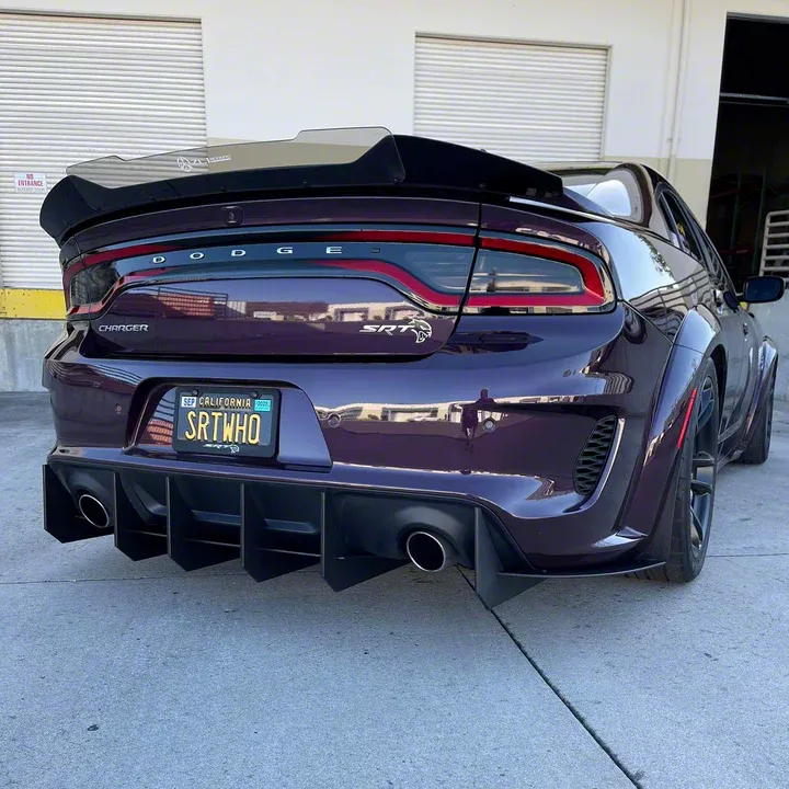 Bold Aesthetic. Transform the rear end of your Charger Widebody with the Stealth Diffuser. This full 3-piece diffuser is designed to enhance the aerodynamics of your vehicle while adding a bold and aggressive aesthetic. Crafted with precision, this diffuser is designed to properly diffuse air, reducing drag and improving stability.