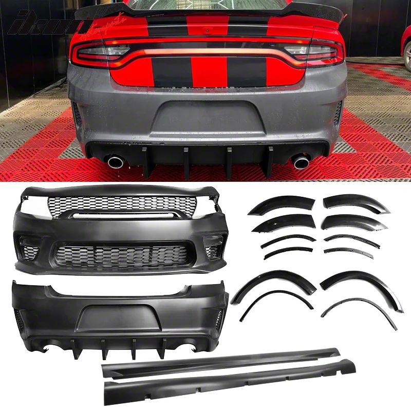 Bold Exterior Upgrade. The Widebody Style Conversion Body Kit transforms the entire look of your 2015-2023 Dodge Charger, giving it a striking and aggressive widebody appearance. Designed for complete coverage and enhancement, this kit includes essential components such as fender flares, a front bumper, side skirts, and a rear diffuser. It's ideal for owners looking to give their ride a bold visual presence and an edge on the street or at shows.