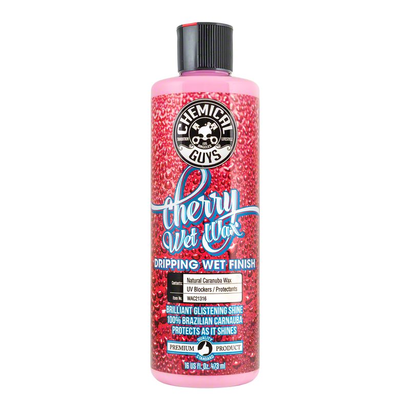 Brilliant Glistening Shine. Chemical Guys Cherry Wet Wax provides a stunning, brilliant shine that enhances your vehicle's paintwork. The high-quality carnauba wax delivers a deep gloss that makes your car look freshly detailed. This 16-ounce bottle ensures that you have plenty of wax to keep your vehicle shining bright and protected for months.