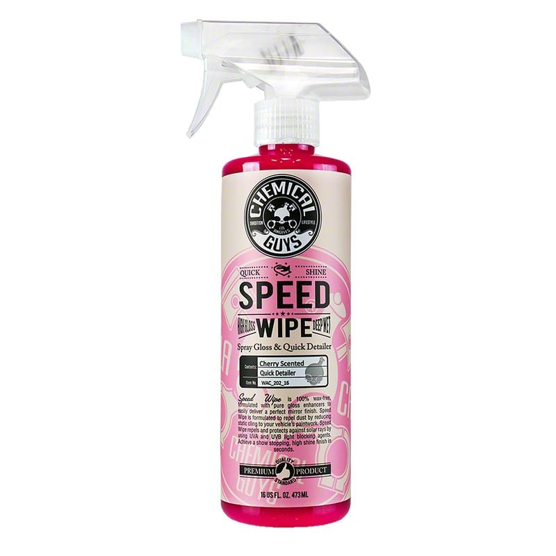 Premium Shine. Elevate the look of your ride with this Chemical Guys Speed Wipe Quick Detailer and High Shine Spray Gloss Cherry Scent; 16-Ounce on your car. Expertly formulated, it not only leaves a lasting shine on your car paint but also prevents dirt and dust from griping on to the paint surface.