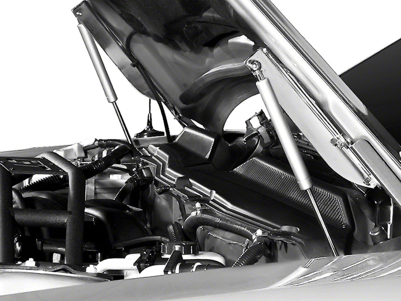 Style And Strength. Designed to get rid of that old ugly prop rod, this set of two powerful yet sleek MMD gas struts not only makes opening your Pony's hood much easier, but also holds it securely in place. Made from lightweight steel and aluminum, they have a chrome and nickel plated finish to give your engine bay a much cleaner appearance.