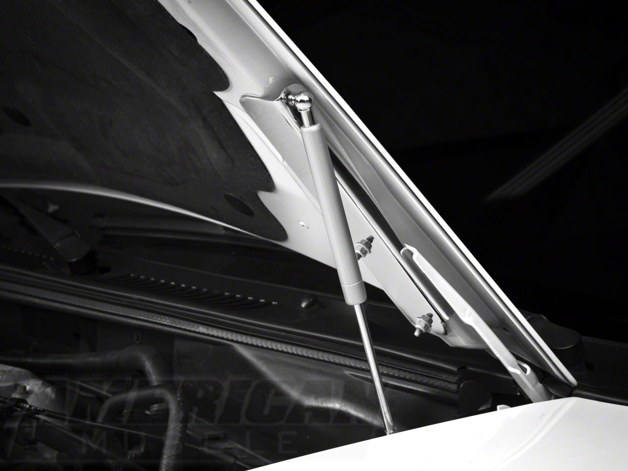 Style And Strength. Designed to get rid of that old ugly prop rod, this set of two powerful yet sleek MMD gas struts not only makes opening your Pony's hood much easier, but also holds it securely in place. Made from lightweight steel and aluminum, they have a chrome and nickel plated finish to give your engine bay a much cleaner appearance.