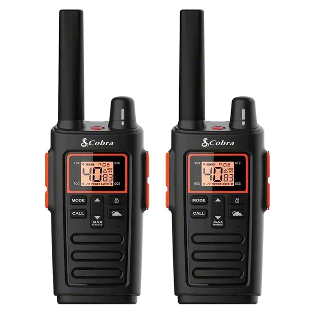 The Cobra RX380 contains a pair of weather-resistant walkie talkies that are perfect for families and friends to use outdoors. With up to 32-mile range, 40 preset channels, NOAA Weather Alerts, built-in LED flashlight, and more, the RX380 walkie talkies provide easy-to-use and clear communication.