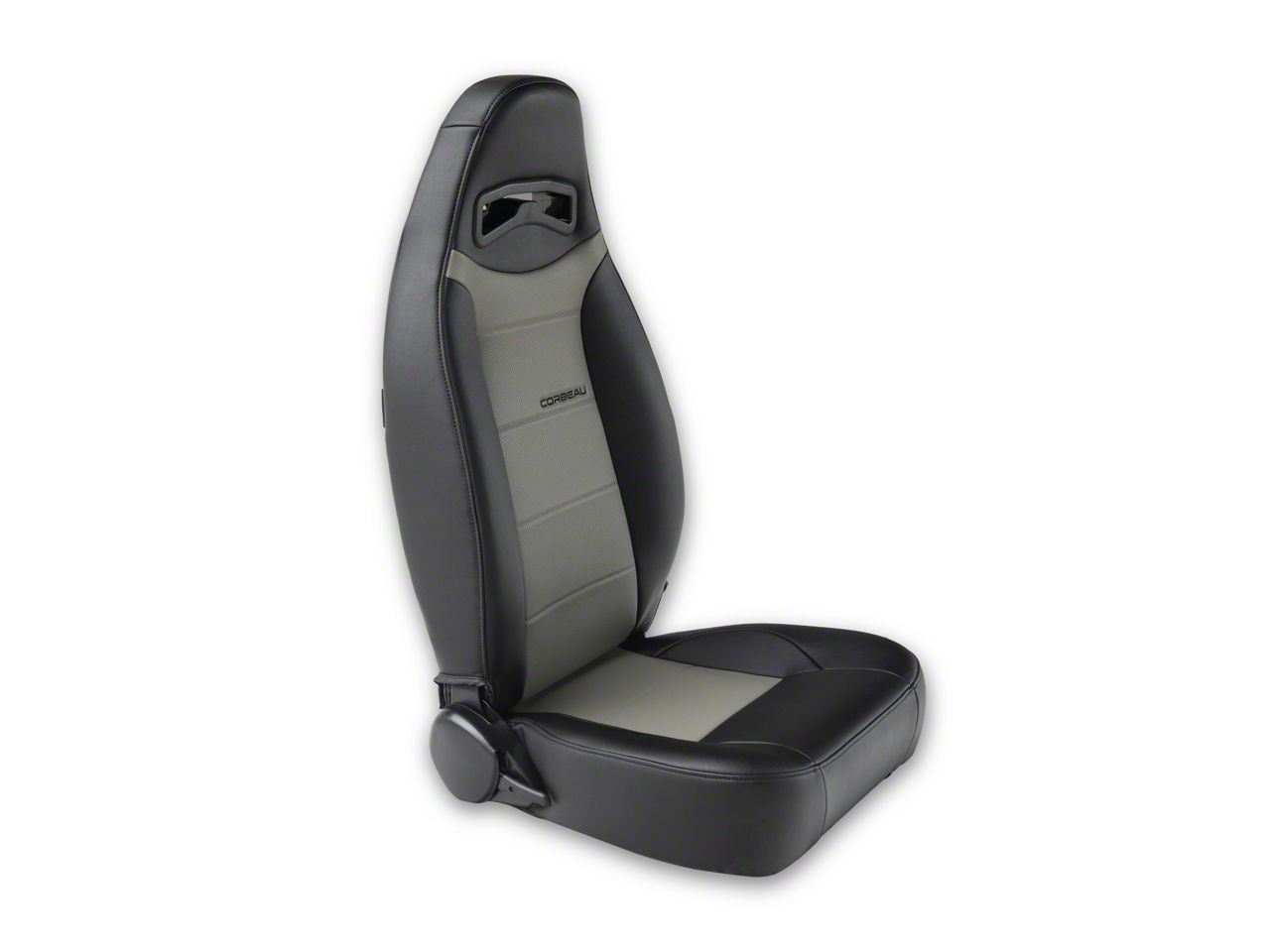 Bring the Performance. Your 1979-2026 Ford Mustang provides you with awesome performance on the road and on the track, but when you're really pushing it, your stock seat might not be enough to hold you in place. So when you want to up your game, check out the Corbeau Moab Reclining Seat - Black Vinyl/Grey Perforated Vinyl - Pair. This classic look and powerful off-road configuration are going to keep you and a passenger in place and in style, thanks to Corbeau's high-quality design.
