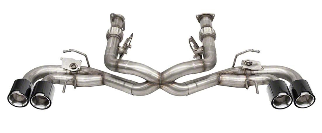 No Drone Tone. Made for the 6.2L Chevrolet Corvette C8 without NPP Dual Mode Exhaust, this Corsa Performance Xtreme Cat-Back Exhaust has a raw metal finish and includes 4 polished carbon fiber tips. Built from 3-inch stainless steel tubing using Corsa NPP Valved Sound Control and RSC No Drone Technology, this exhaust offers an aggressive sound without the droning ringing.