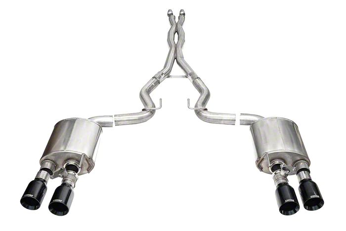 Corsa Performance Xtreme Valved Cat-Back Exhaust. The Corsa Performance Xtreme Valved Cat-Back Exhaust is designed for the 2024-2026 Mustang Dark Horse models. This exhaust system includes (4) 4.5-inch straight cut tips with a glossy black finish, adding a stylish look. The dual rear exit model features a raw metal finish, enhancing the high-performance aesthetic. It is louder by over 8+ decibels than the stock exhaust, providing an exhilarating sound while maintaining a quiet and drone-free experience.