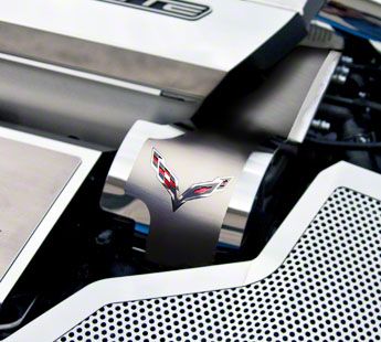 Premium Engine Bay Accent. The Alternator Cover with Crossed Flags Emblem adds a bold visual upgrade to your Corvette C7's engine bay. Featuring a garnet red vinyl inlay and the iconic crossed flags emblem, this officially licensed GM product brings style and distinction under the hood.