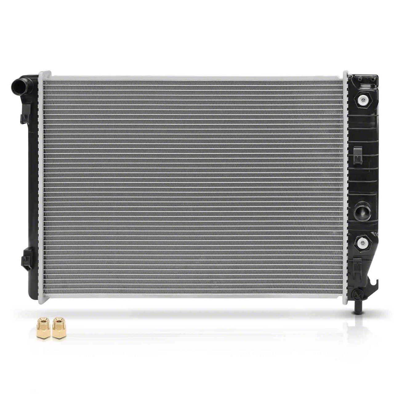 High-Performance Cooling System. The Aluminum Radiator with Transmission Oil Cooler is engineered to efficiently dissipate heat, ensuring your engine and transmission maintain optimal operating temperatures. This design supports vehicle performance by preventing overheating, which can cause engine damage and reduce system longevity.