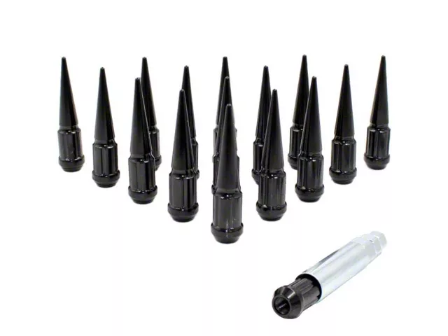 Striking Black Spike Lug Nuts. This Black Spike Lug Nut Kit is designed with SAE-compliant construction, ensuring a secure fit and reliable performance. Coming in a set of 20, these lug nuts feature a striking black chrome finish that enhances the appearance of your wheels. Built specifically for aftermarket wheels, they are not compatible with factory wheels.