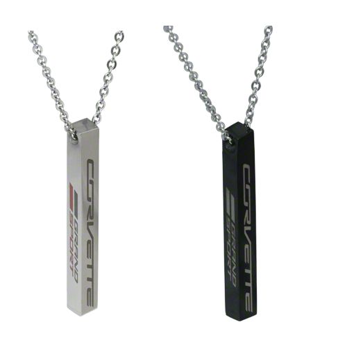 This C7 Corvette Grand Sport pillar bar pendant comes with the Corvette signature on the front and the C7 Grand Sport on two sides. The pendant measures 2” long by 3/16″ wide, is made in stainless steel and includes an 18″ cable chain with lobster clasp.