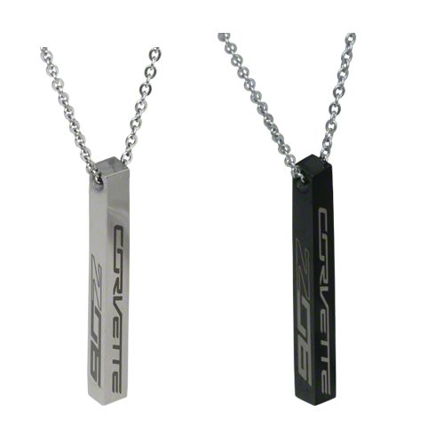 This C7 Corvette Z06 pillar bar pendant comes with the Corvette signature on the front and the C7 Z06 emblem on two sides. The pendant measures 2” long by 3/16″ wide, is made in stainless steel and includes an 18″ cable chain with lobster clasp.