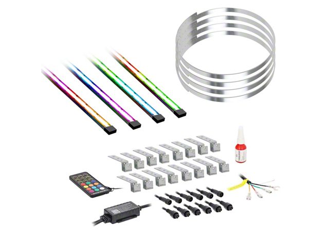 Construction and Appearance. Built for rugged use and outdoor exposure, this LED kit features weather-resistant components and an adjustable frame for versatile fitment. It offers millions of RGBW color combinations, bright white output, music-reactive modes, and is fully controllable through the Enlight10 app. Horizon10/Horizon12 integration enables smart sync with infotainment systems for seamless functionality.