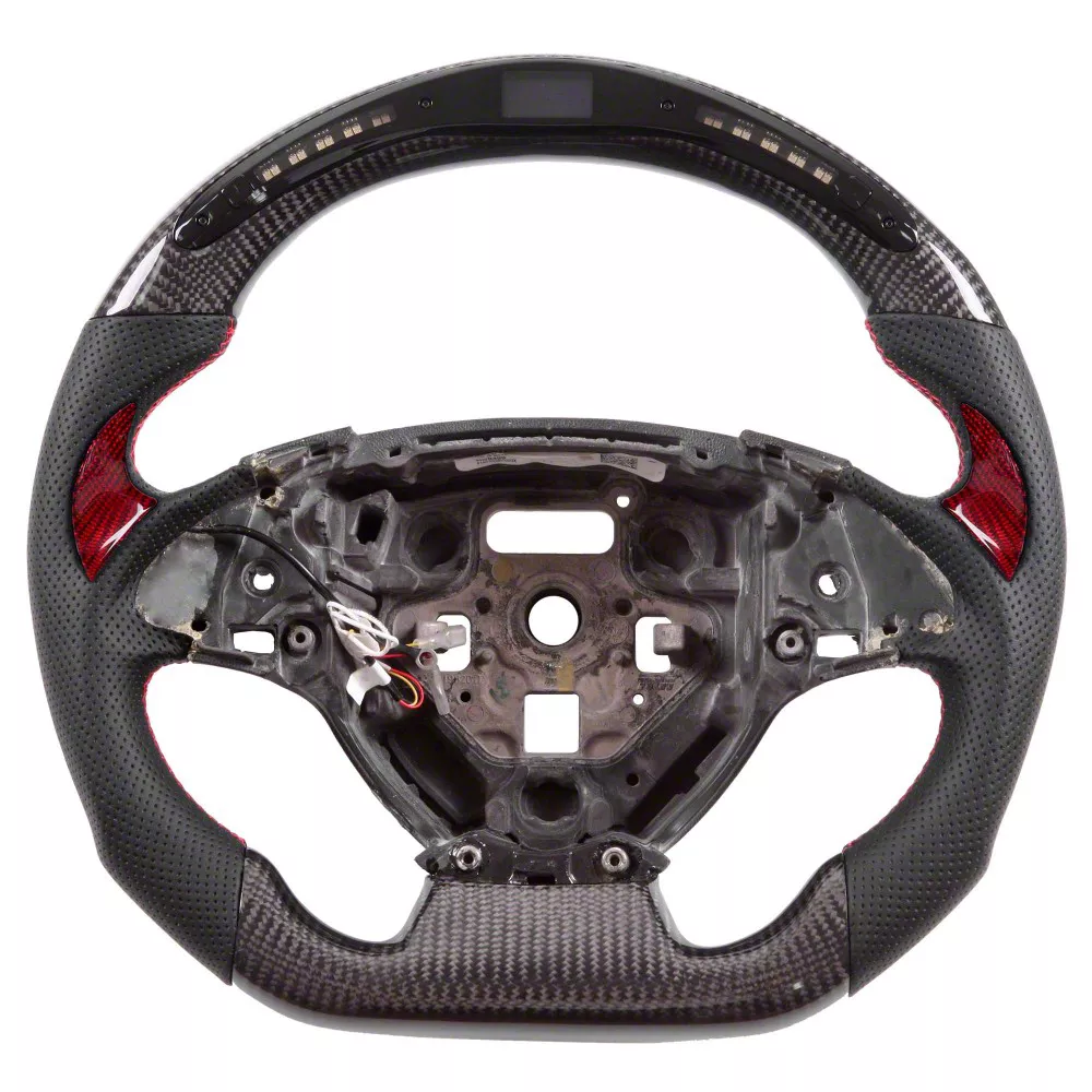 Enhanced Look and Control. Crafted from high-quality carbon fiber, this Custom Carbon Fiber Steering Wheel with LED Dash Display offers a sleek and sporty aesthetic that perfectly complements the Corvette C7's iconic design. The carbon fiber construction ensures durability and lightweight performance, allowing for precise control and a comfortable grip while driving.