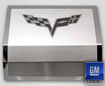 Construction and Appearance. Crafted from 100% stainless steel, this fuse box cover is built to resist tarnishing, fading, and rust. The piece is hand-fabricated and finished with a polished or brushed surface, featuring a prominent C6 logo crossed flags emblem. The vinyl color inlay options enable tailored aesthetic coordination with your Corvette.