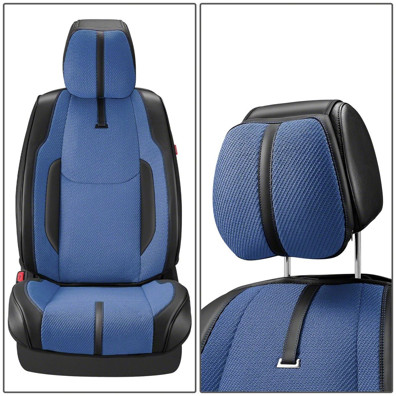 Construction and Appearance. Featuring a bold dark blue and matte black finish, the Drive Series Seat Covers combine modern styling with tough, high-quality materials. Each cover is precision-stitched for a secure fit that resists stretching, tearing, and fading over time. The dual-tone finish complements a wide range of interior color schemes while maintaining a sleek, professional look. Built to be soft to the touch yet highly durable, these covers provide protection without sacrificing comfort. Their resilient fabric layer prevents damage from friction and UV exposure, keeping seats looking new for years of use.