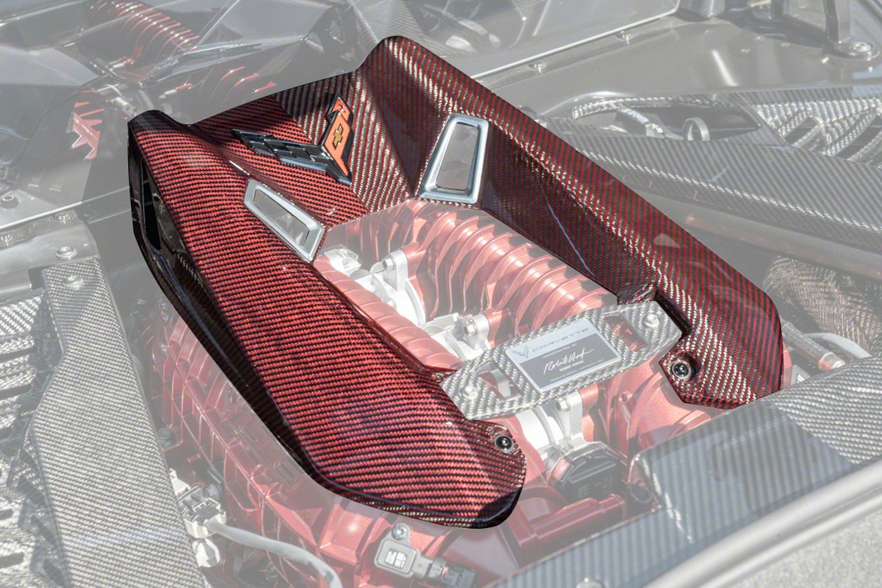 Stylish Engine Protection. The Engine Cover, designed specifically for your Chevrolet Corvette C8 Z06 model, offers a significant aesthetic upgrade for the vehicle's engine bay. Furthermore, this cover features a striking red carbon fiber finish, adding a touch of sophistication and modern flair under the hood.
