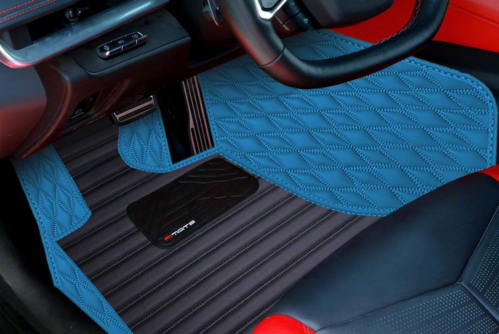 Kind to the Environment. These mats, meticulously tailored for a precise fit, exude luxury with light blue coloring complemented by striking stripe stitching at the center and diamond stitching on the sides. Crafted from 5-layer eco-friendly compounds, they offer unparalleled durability while being kind to the environment.