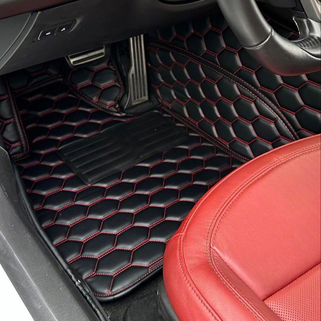 Construction and Appearance. Made from high-quality artificial leather, these floor mat liners offer superior strength and wear resistance. The matte red finish and honeycomb stitching add a stylish touch that complements your vehicle’s interior. They are designed to be a direct replacement for your original floor mats, providing both functional protection and an upgraded look.