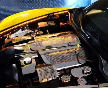 Stylish Engine Bay Enhancement. The Illuminated Plenum Cover is designed to add a striking visual element to your 2008-2013 Corvette C6 models, excluding Z06 and ZR1 models. Featuring a perforated design and bright green LED light output, this cover enhances the aesthetics of your engine bay, providing a unique and eye-catching upgrade.