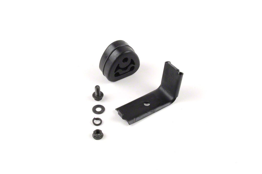 Construction and Appearance. Featuring a matte black finish, this hanger includes a durable rubber isolator and a precision-formed metal mounting brace. The high-strength fasteners—nut, bolt, washer, and split-lock washer—ensure long-lasting performance and corrosion resistance in high-temperature exhaust environments.