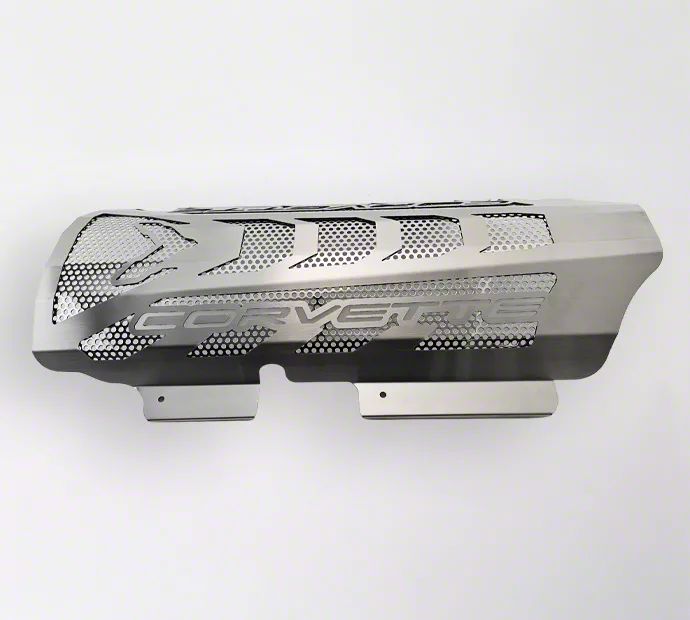 Construction and Appearance. Crafted from 100% durable brushed stainless steel, this engine shroud features a perforated insert with laser-cut font style 'CORVETTE.' The finish resists tarnishing, fading, and rust, ensuring a long-lasting, high-end look. Options include plain, carbon fiber inlays, or LED illuminated inserts, allowing for tailored visual appeal.