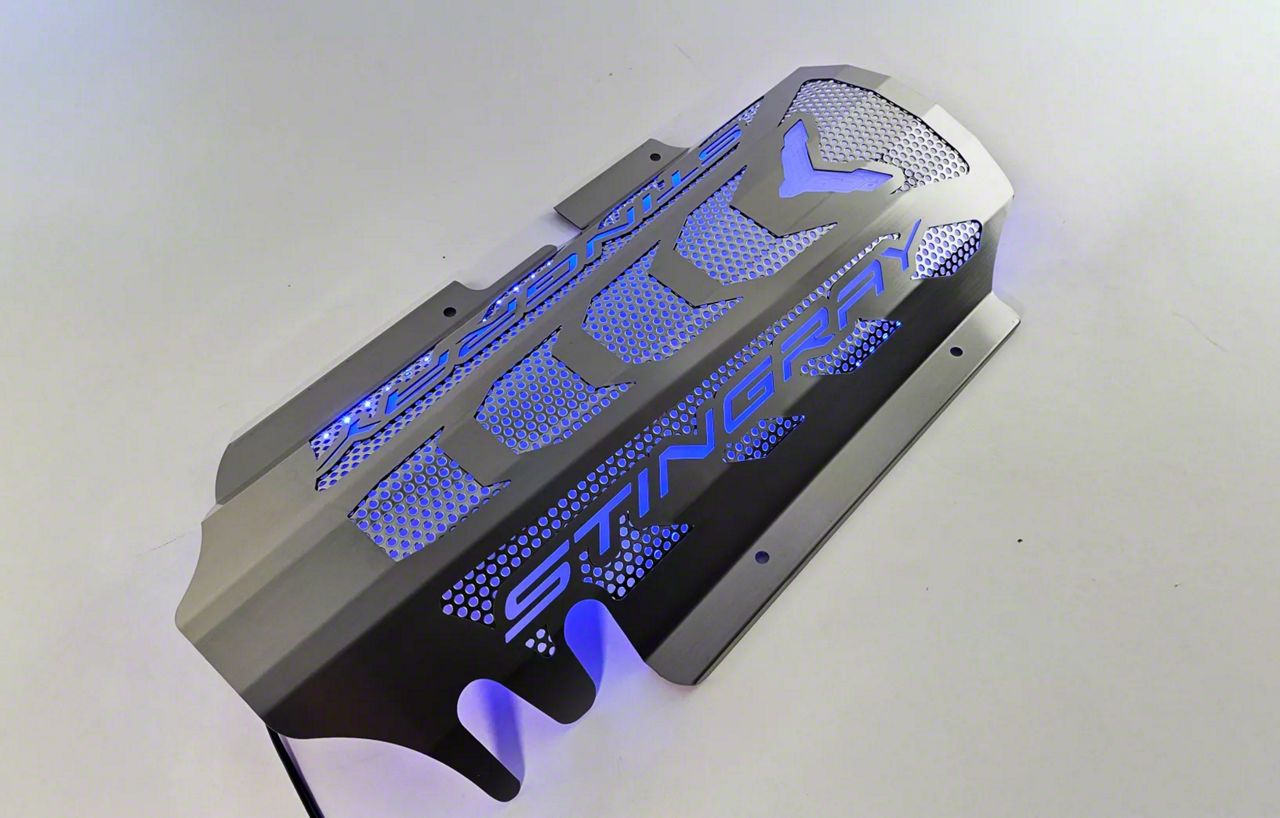 Engine Bay Enhancement. The replacement engine shroud with perforated inserts and laser-cut 'STINGRAY' font elevates the aesthetic appeal of the mid-engine Corvette by giving its engine bay a show-car quality look. This accessory allows for customization of style and illumination, transforming the engine compartment into a standout feature.