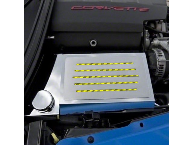 Description. Dress up your Corvette with our Polished Stainless Steel Fuse Box Cover with Laser-cut Ribbed Slots. Fuse box cover fits 2014-2019 Z06/Z51/C7 Corvettes over the fuse box and adds a clean stylish look to your Corvette engine bay. The laser-cut Ribs feature your choice of vinyl inlaid color. Choose a vinyl inlay color to coordinated this part to your Corvettes engine bay. Many colors options to choose from. Compliments our Polished and Brushed Corvette Stingray Plenum Cover - 053001.