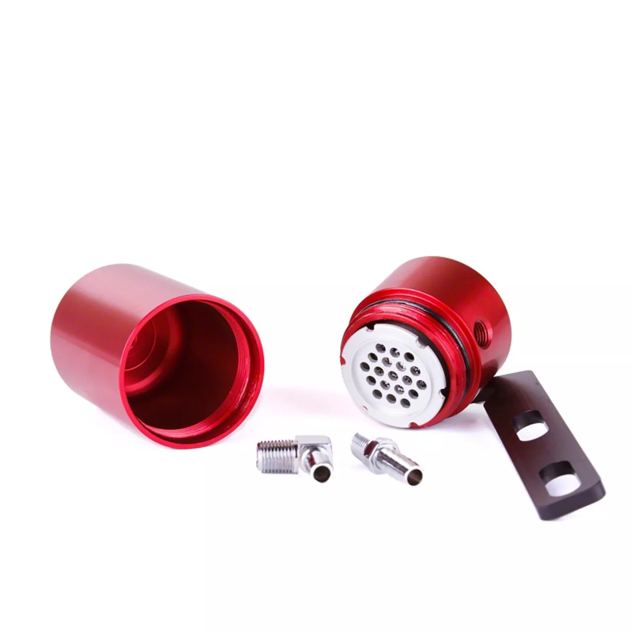 Construction and Appearance. Crafted from red anodized 6061-T6 billet aluminum, the catch can features a 3-chamber internal baffle system and stainless steel mesh for superior oil separation. Black AN fittings, braided stainless hoses, and a custom CNC-machined mounting bracket ensure durability and an OEM-quality appearance. It stores up to 8 ounces of oil and is compatible with SAE 30R7 fuel and vapor lines.