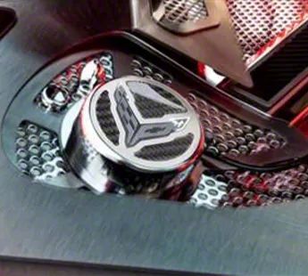 Construction And Appearance. These shock tower cover inserts feature genuine carbon fiber top plates set within perforated stainless steel frames. The combination creates a balanced contrast between high-performance textures and polished metal elements. Each cover includes a laser-etched C8 emblem for a custom, authentic look that elevates the mid-engine Corvette aesthetic.