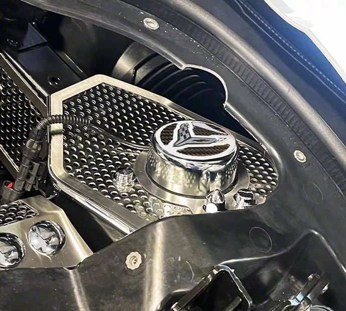 Engine Bay Style Upgrade. The Shock Tower Covers with Corvette Flag are the perfect way to enhance the look of your C8 Convertible's engine bay. Featuring brushed stainless steel and carbon fiber accents, these covers add a premium visual touch while proudly displaying the iconic Corvette flag emblem.