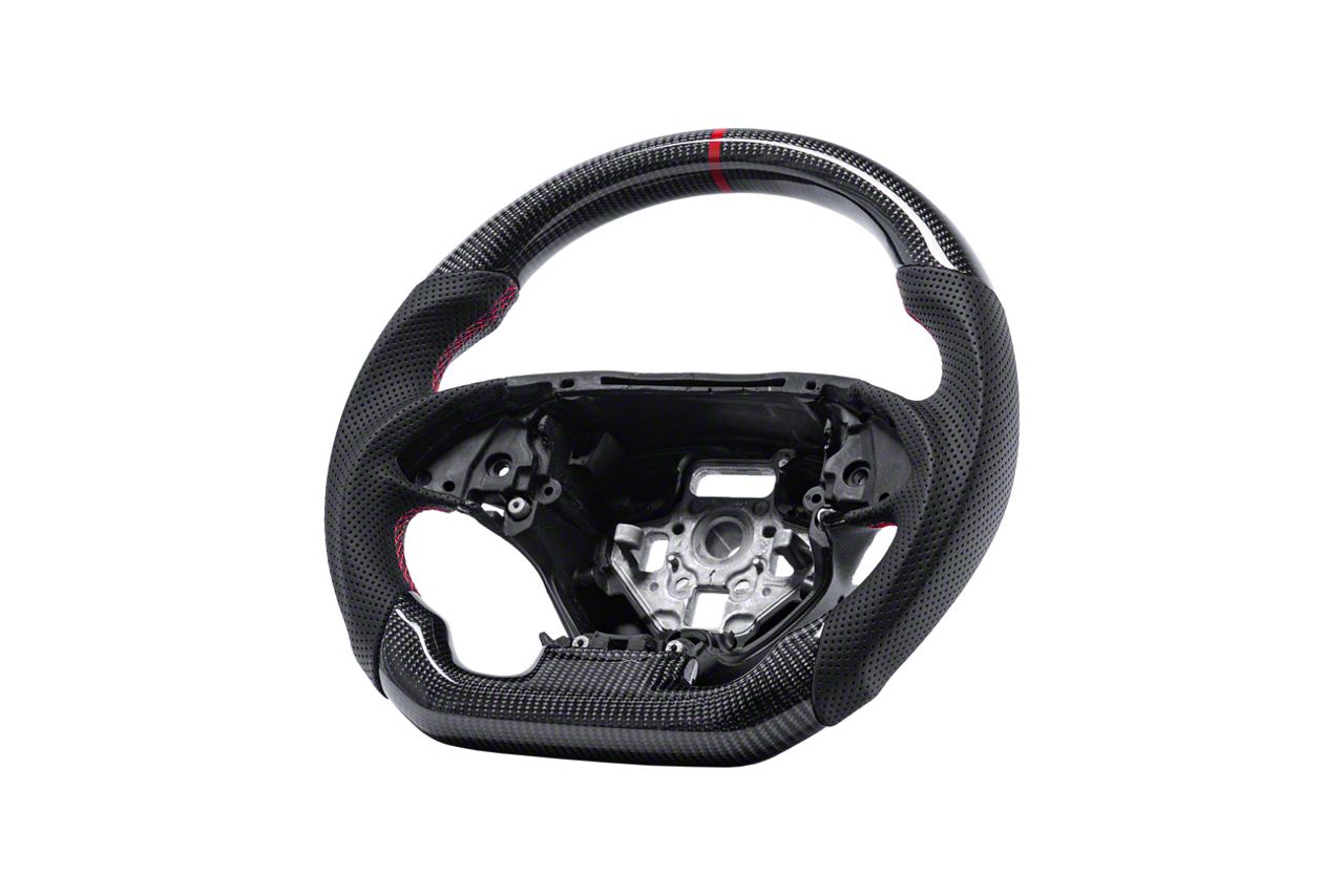 Construction and Appearance. Crafted from top-grade Carbon Fiber with Red Stripe materials, this steering wheel boasts a durable and luxurious feel. What's more? The red stripe adds a striking visual element, while the symmetrical design and pre-cut measurements ensure a perfect fit.
