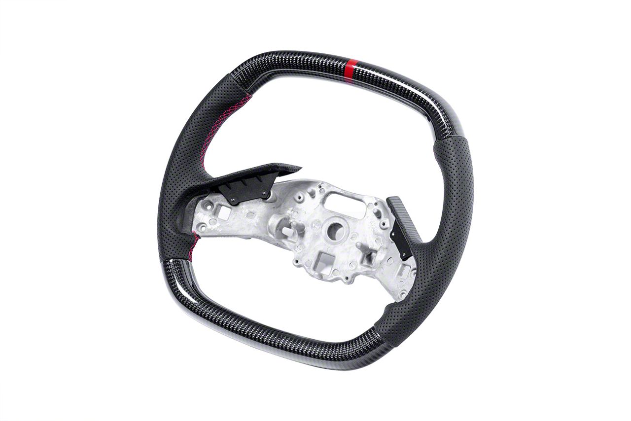 Stylish and Performance-Driven Steering Wheel. The Steering Wheel with a glossy black carbon fiber finish and a red stripe offers a blend of style and functionality for your Corvette C8. This GM stock style flat top steering wheel enhances the look and feel of your vehicle's interior.