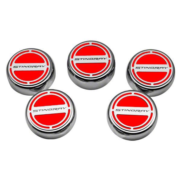Distinctive Stingray Script Covers. The Stingray Script Fluid Cap Covers (Solid Bright Red) add a bold touch to your 2014-2019 Chevrolet Corvette C7. These stylish caps enhance the engine bay's appearance while protecting and identifying key fluid reservoirs with a custom flair. A must-have accessory for enthusiasts looking to personalize their Corvette.