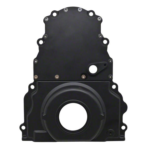 ALUMINUM CHEVY LS TWO PIECE TIMING CHAIN COVER W CAM SENSOR HOLE - BLACK Fits the LS family of engines up to GEN IV with rear mounted cam sensors. (Will not fit double roller timing chains)