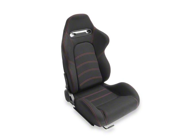 Durable and Supportive Racing Seats. These Woven Fabric Racing Bucket Seats are designed for high durability, featuring a black woven fabric upholstery with striking red contrast stitching. The racing bucket design offers superior lateral support, ideal for performance driving and track use.