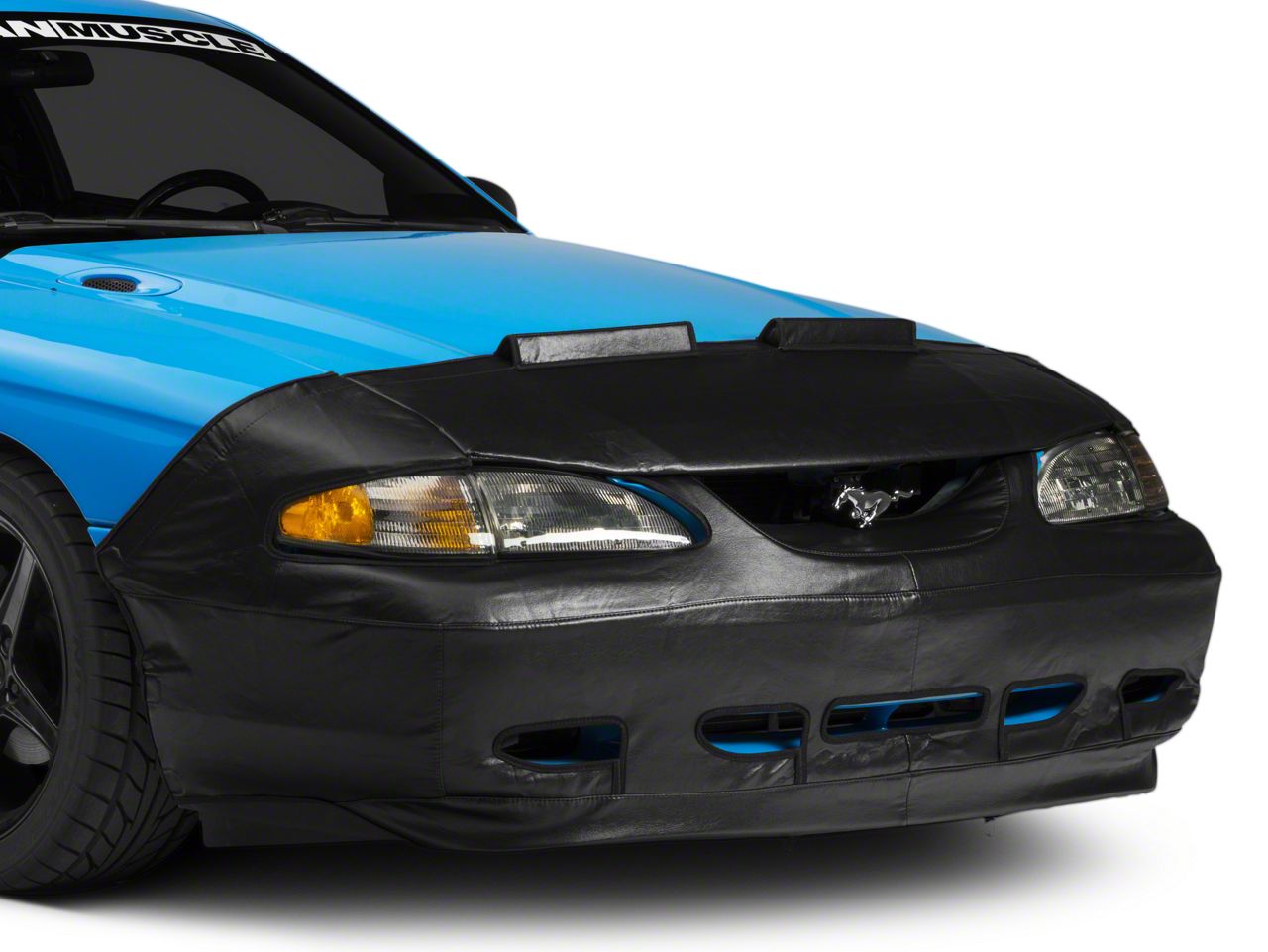 Vehicle Paint Protected. The paint on your Mustang will be protected with the soft flannel backing. The reinforced vinyl coated hooks and padded tabs were designed to secure the car bra while protecting the vehicle paint. It was made with 25 oz. black crush vinyl that features double stitching and padding for exceptional strength.