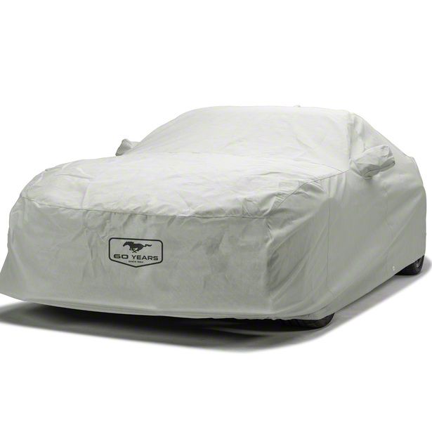 Premium Mustang Protection. The 3-Layer Moderate Climate Car Cover with Antenna Pocket and Mustang 60th Anniversary Logo; Gray offers reliable protection for your Mustang against everyday elements such as dust, moisture, and UV rays. Designed for moderate climates, it shields your vehicle from environmental damage while maintaining a custom fit tailored to your car’s specifications.