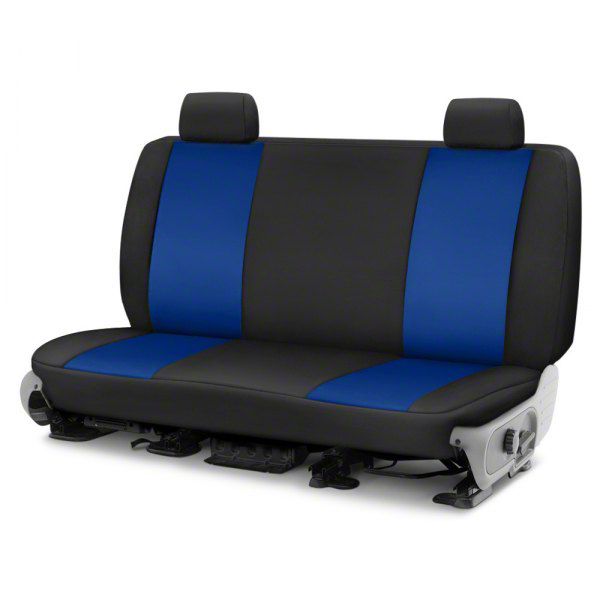 Construction and Appearance. Crafted from a durable nylon/polyester blend with a durable water repellent finish, this seat cover features foam backing for added comfort and full coverage including molded headrests. Its blue and black color scheme offers a sleek look paired with expert stitching to ensure longevity and a precise fit.
