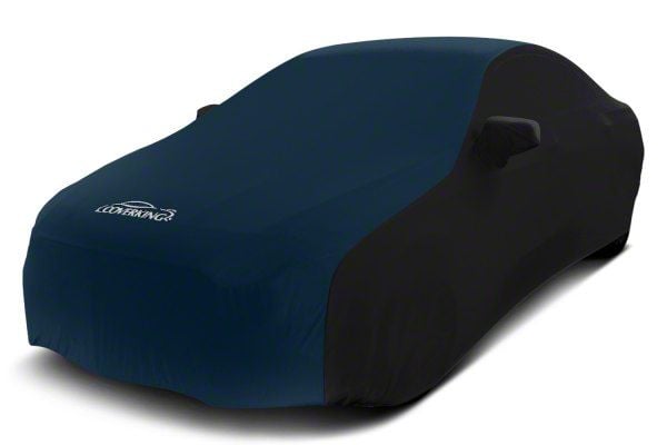 Description. Car Cover; Custom Vehicle Cover Satin Stretch; 2-Tone Black Sides Dark Blue Center